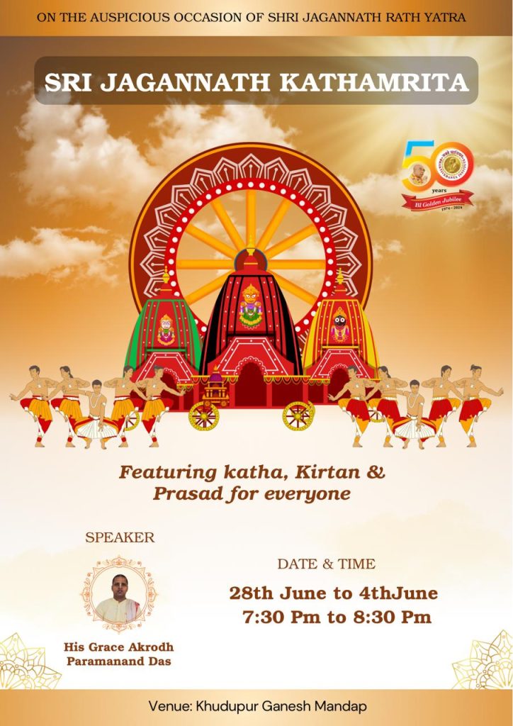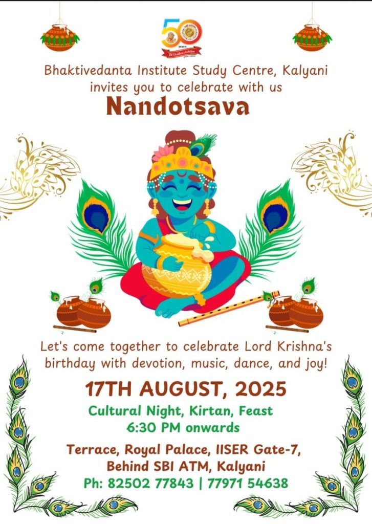 Organized by Bhaktivedanta Institute Study Center, Kalyani. Attractions: – Cultural Night – Kirtan – Feast & many more… Place: Royal Palace, IISER Gate-7, Kalyani Date | Time: August 17, 2025 | 6:30 pm onwards Join | Contact: +91 8250277843