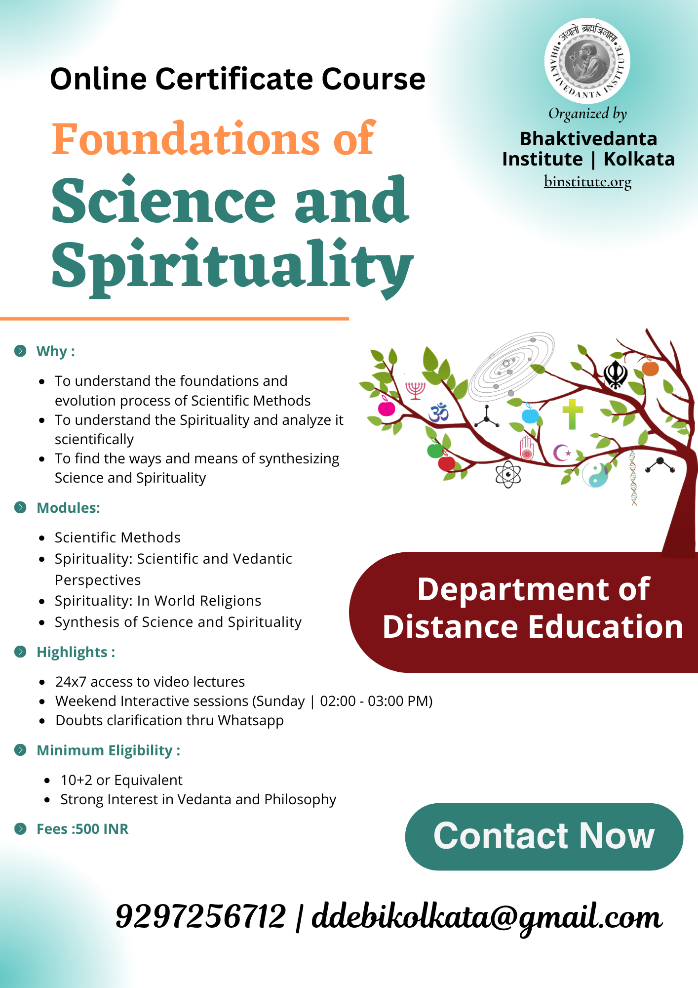 Module 1 – Scientific Methods, Module 2 – Spirituality, Module 3 – Spirituality of World Religions, Module 4 – Synthesis of Science and Spirituality